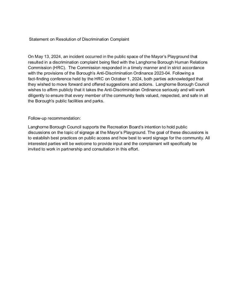 At the January 8th, 2025 Council Meeting, Langhorne Borough Council presented a statement on the complaint filed with the HRC as a result of an incident that occurred at the Mayors’ Playground on May 13, 2024. Included in the statement is Council’s support for the recommendation made by the HRC regarding signage at the playground.